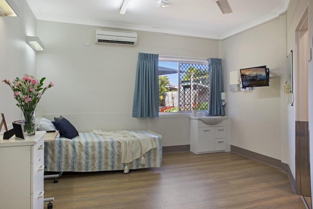 Inclusions: single bed, overbed table, individual reverse-cycle air-conditioning, ceiling fan, armchair, wardrobe, space for personal small furniture items, wall-mounted TV, emergency call system.