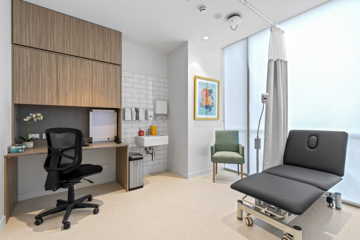 Inclusions: automated king-single bed, electric recliner chair, armchair for visitors, built-in desk space, individual climate-controlled air conditioning, ample storage, large-wall mounted TV, kitchenette stone benchtop and sink, mini-fridge, emergency call system, floor-to-ceiling windows, electronic ceiling hoist.