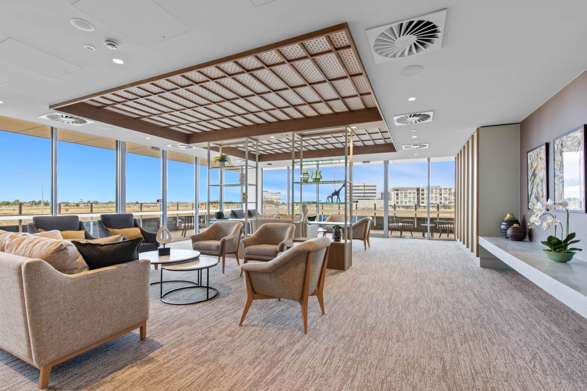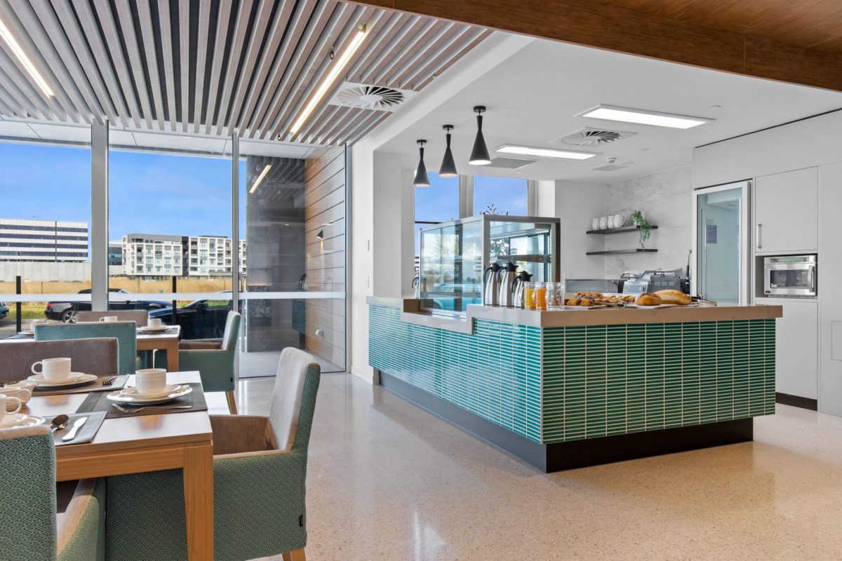 Inclusions: automated king-single bed, electric recliner chair, overbed table, individual climate-controlled air conditioning, armchair for visitors, ample storage, large wall-mounted TV, kitchenette stone benchtop and sink, mini-fridge, desk, emergency call system, floor-to-ceiling windows, electronic ceiling hoist.