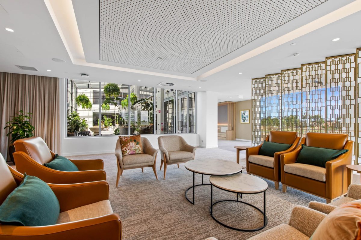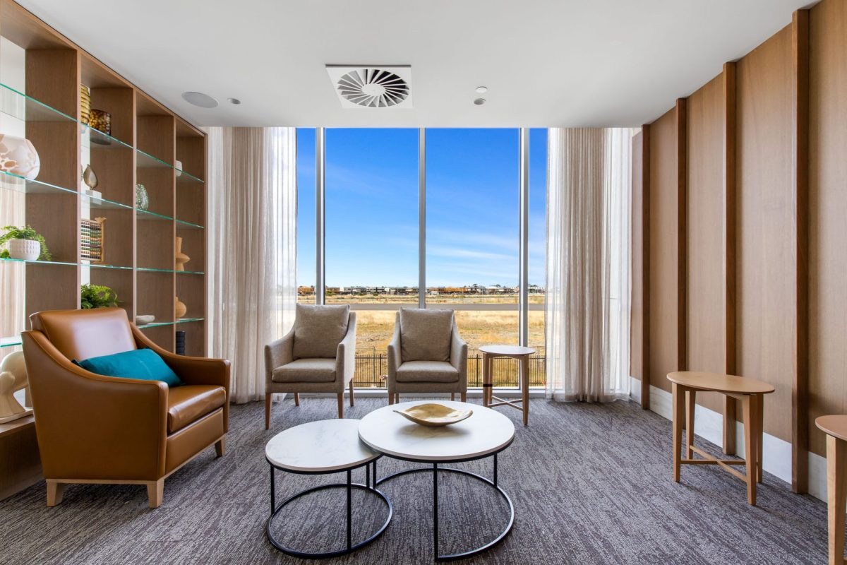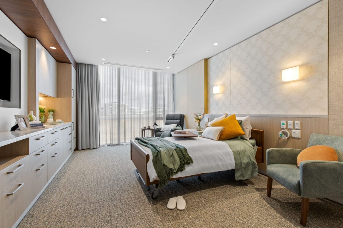 Inclusions: automated king-single bed, electric recliner, overbed table, individual climate-controlled air conditioning, ample storage, armchair for visitors, wall-mounted TV, mini-fridge, ceiling hoist, emergency call system.