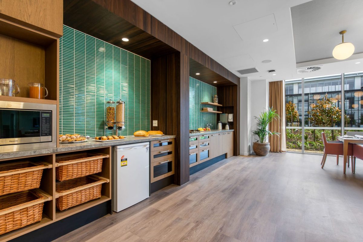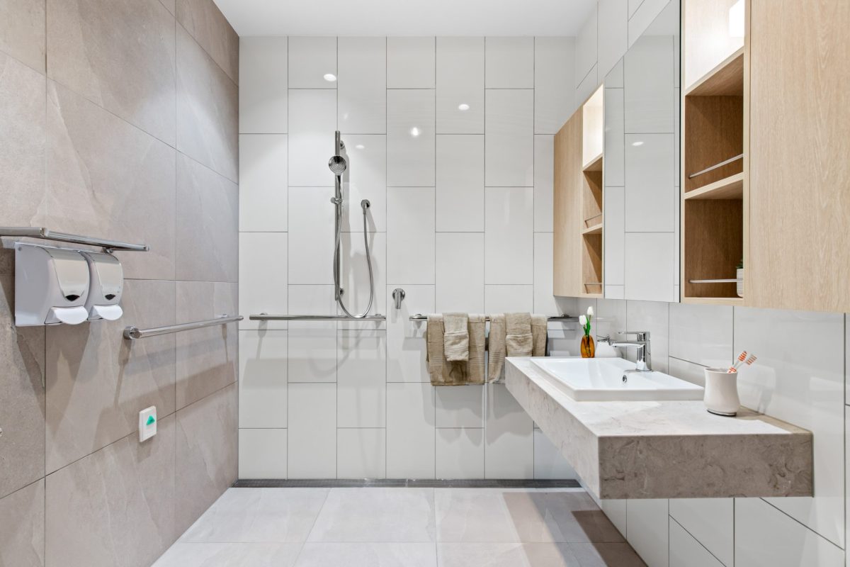 Inclusions: automated king-single bed, electric recliner chair, overbed table, individual climate-controlled air conditioning, armchair for visitors, ample storage, large wall-mounted TV, kitchenette stone benchtop and sink, mini-fridge, desk, emergency call system, electronic ceiling hoist.