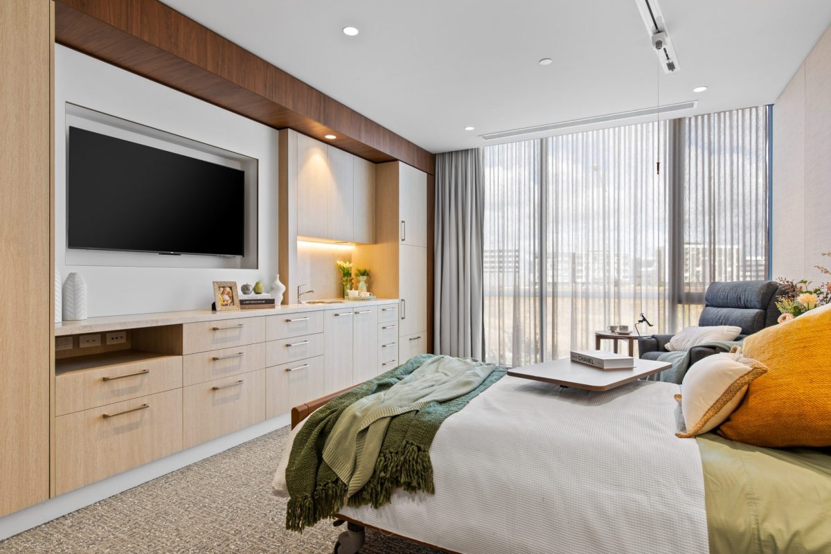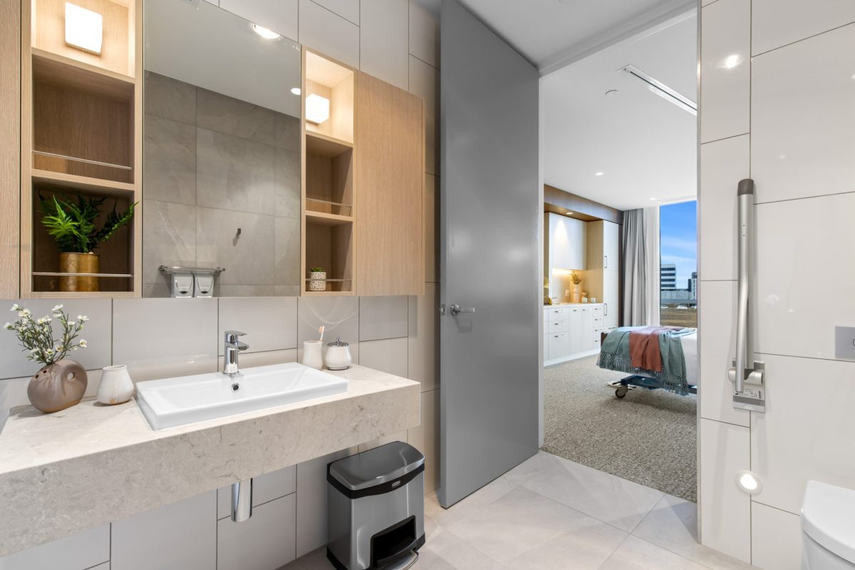 Inclusions: automated king-single bed, electric recliner chair, overbed table, individually climate-controlled air conditioning, armchair for visitors, ample storage, large wall-mounted TV, kitchenette stone benchtop and sink, mini-fridge, emergency call system, floor-to-ceiling windows, electric ceiling hoist.