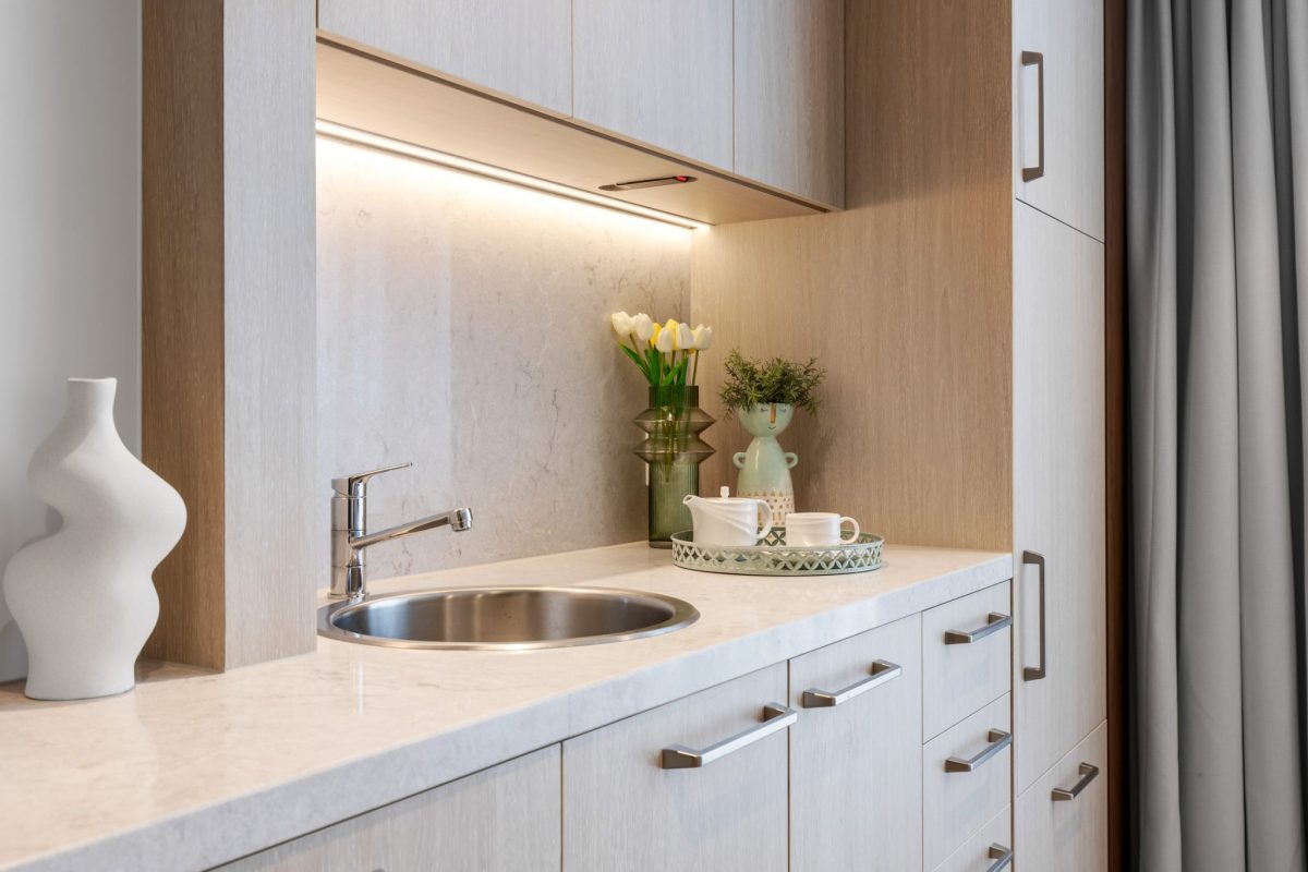 Inclusions: automated king-single bed and electric ceiling hoist, electric recliner chair, armchair for visitors, overbed table, dining table and chairs, individual climate-controlled air conditioning, ample storage, large wall-mounted TV, kitchenette stone benchtop and sink, mini-fridge, emergency call system, floor-to-ceiling windows, electric ceiling hoist.