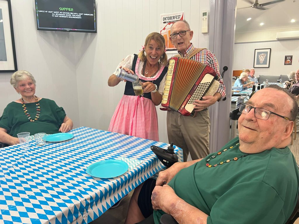 Beer, bratwurst, and good company. Oktoberfest 2024 celebrations were a huge hit with our residents, with a terrific 55 people attending the event at Kawana Waters Aged Care Residence! We enjoyed sampling Bavarian beers from Germany and indulging in traditional foods like goulash with pretzels, leberkaese with bratwurst and sauerkraut, obatzter with rye bread, and Bavarian biscuits. The festive vibe was set with lively German music and plenty of laughs – a fun afternoon for everyone. Prost!